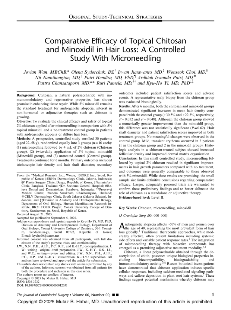 Chitosan, a natural polysaccharide with immunomodulatory and regenerative properties, has shown promise in enhancing tissue repair. While 5% minoxidil remains the standard treatment for androgenetic alopecia, interest in non-hormonal or adjunctive therapies such as chitosan is growing.