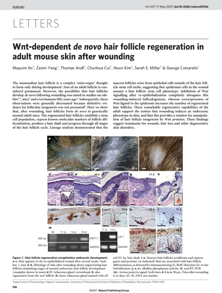 Here we show that, after wounding, hair follicles form de novo in genetically normal adult mice. The regenerated hair follicles establish a stem cell population, express known molecular markers of follicle differentiation, produce a hair shaft and progress through all stages of the hair follicle cycle.