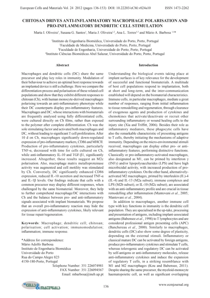 Here we compare the differentiation process and polarisation of these related cell populations and show that they exhibit different responses to chitosan (Ch), with human monocyte-derived macrophages polarising towards an anti-inflammatory phenotype while their DC counterparts display pro-inflammatory features. Macrophages and DC, whose interactions with biomaterials are frequently analysed using fully differentiated cells, were cultured directly on Ch films, rather than exposed to the polymer after complete differentiation.